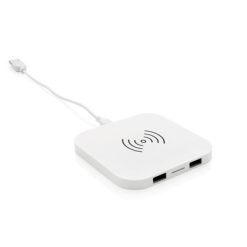Ładowarka bezprzewodowa 5W, wykonana z ABS, dwa wyjścia USB do ładowania telefonów starszej generacji za pomocą kabla, bezprzewodowe ładowanie jest kompatybilne ze wszystkimi urządzeniami posiadającymi możliwość ładowania indukcyjnego, wejście 1A, wyjście USB 5V/1A, wyjście bezprzewodowe 5W, ślad węglowy produktu: 1,06 kg CO2
