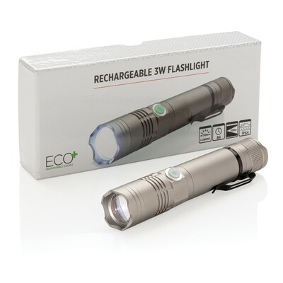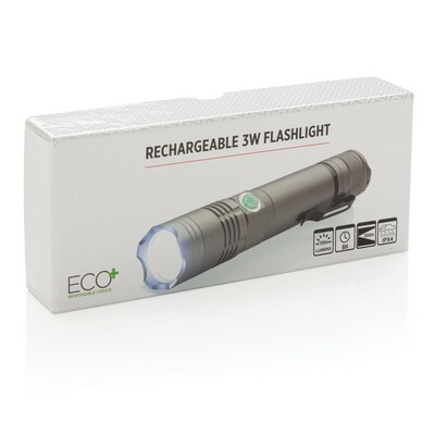 Latarka 3W, możliwość ponownego naładowania, odporna na niekorzystne warunki pogodowe (IPX 4), zasięg światła do 200 m (130 lumenów), 3 tryby świecenia (silny, normalny, światło migające), wbudowany akumulator 2200 mAh pozwala na użytkowanie do 8 godzin, ponowne naładowanie w około 2 godziny, kabel micro USB do ładowania w komplecie, ślad węglowy produktu: 2,18 kg CO2