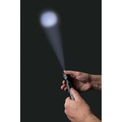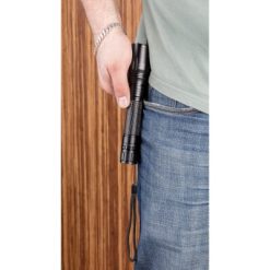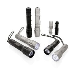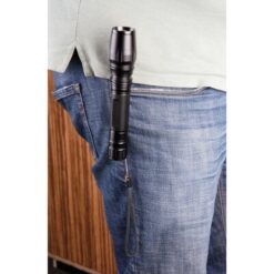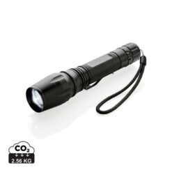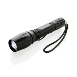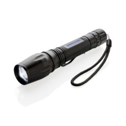 Latarka CREE LED 10W o bardzo jasnym świetle, wykonana z aluminium, 250 lumenów, wytrzymała, wodoodporna IPX4 (całkowita ochrona przed spryskiwaniem i zachlapaniem wodą z różnych kierunków z natężeniem do 10 litrów na minutę) i wstrząsoodporna (upuszczenie nawet z 1 metra), funkcja zoom, klip do paska, czas pracy do 6 godzin, baterie w komplecie, ślad węglowy produktu: 2,56 kg CO2