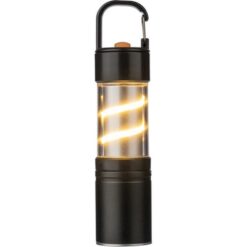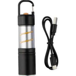 Latarka COB z metalowym klipsem, czarnym karabińczykiem ułatwiającym przypięcie, 3 tryby świecenia, funkcja zoom, przycisk włączający, magnetyczna podstawa, ładowana przez złącze USB-C, czarny kabel 30 cm w komplecie, zapakowana w brązowe kartonowe pudełko, produkt wykonany z ABS i metalu