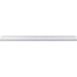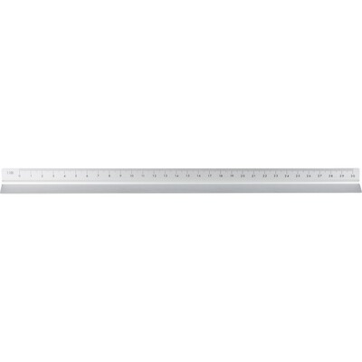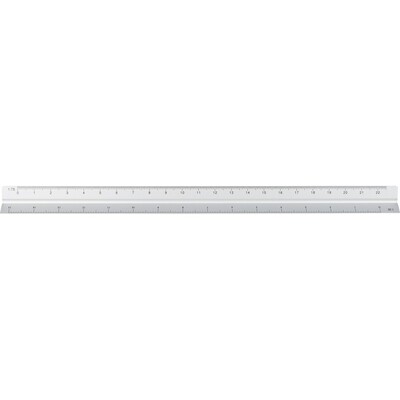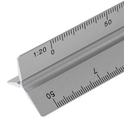 Linijka trójkątna 30 cm z różnymi skalami: 1:20, 1:25, 1:50, 1:75 , 1:100, pakowana pojedynczo w brązowe kartonowe pudełko z ilustracją, produkt wykonany z aluminium