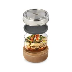 Pudełko śniadaniowe 750 ml, wykonane ze szkła, podstawa pojemnika wykonana jest z polipropylenu połączonego z włóknem drzewnym, metalowe wieczko, można myć w zmywarce