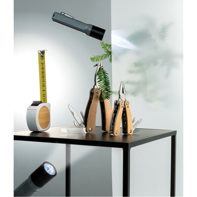 Trwałe i wytrzymałe narzędzie wielofunkcyjne, wykonane z wysokiej jakości stali nierdzewnej, uchwyt z drewna bukowego, 13 funkcji: długie szczypce, kombinerki, przecinak do kabli i drutu, ostrze ząbkowane, otwieracz do butelek, duży śrubokręt płaski, śrubokręt krzyżakowy, nóż, piła, mały śrubokręt płaski, otwieracz do puszek, średni śrubokręt płaski, pilnik, w ozdobnym pudełku, ślad węglowy produktu: 1,01 kg CO2