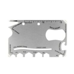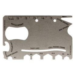 Narzędzie wielofunkcyjne w etui, posiada 9 funkcji: linijka (5 cm / 2 cale), mini wkrętak, otwieracz do kartonu, 2x wkrętak, klucze płaskie (#2, #4, #6, #8, #10, #12), podstawka pod telefon (karta nie jest dołączona), otwieracz do puszek, otwieracz do butelek, produkt wykonany ze stali nierdzewnej