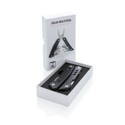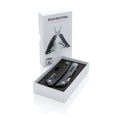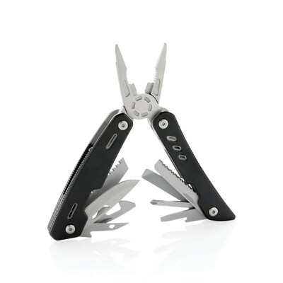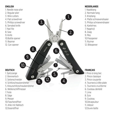 Narzędzie wielofunkcyjne, trwałe i wytrzymałe, wykonane ze stali nierdzewnej, aluminiowy uchwyt, 12 funkcji: szczypce, kombinerki, przecinak do kabli i drutu, nóż, śrubokręt krzyżakowy, mały śrubokręt płaski, piła, otwieracz do puszek, otwieracz do butelek, ostrze ząbkowane, szpikulec, pilnik i duży śrubokręt płaski, w ozdobnym pudełku, ślad węglowy produktu: 2,75 kg CO2