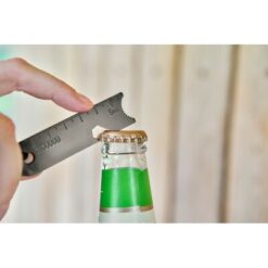 Wielofunkcyjne narzędzie, funkcje: krzesiwo, skrobak, otwieracz do butelek, klucz sześciokątny, sznurek ułatwiający noszenie zapakowane w brązowe kartonowe pudełko, produkt wykonany z metalu i drewna sosnowego