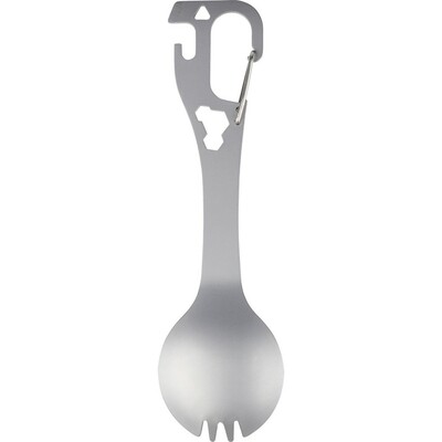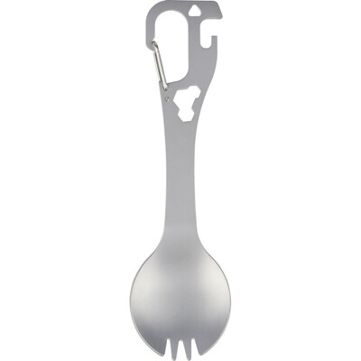 Narzędzie wielofunkcyjne zawiera: łyżkę, widelec, otwieracz do puszek i butelek, płaski śrubokręt, trzy klucze imbusowe, karabińczyk ułatwiający przypięcie, zapakowany pojedynczo w papierowe pudełko, produkt wykonany ze stali nierdzewnej 430