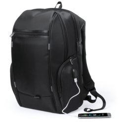 Nieprzemakalny plecak, miękka przegroda na laptopa 15″, gniazdo USB do ładowania telefonów (power-bank nie jest dołączony), kabel micro USB w komplecie, przednia kieszeń zamykana na zamek, miękki tył i paski na ramię