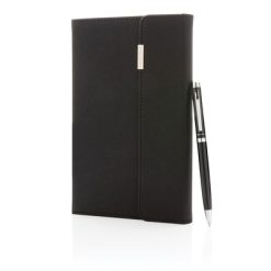 Luksusowy notatnik A5 (80 kremowych kartek 80 g/m2 w linie), okładka wykonana z PU z metalowym logo, długopis z niemieckim wkładem w komplecie, długość pisania ok. 1200 m, w ozdobnym pudełku, ślad węglowy produktu: 1,34 kg CO2