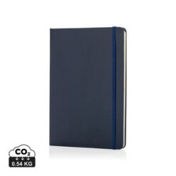 Notatnik A5 (72 kremowe kartki 70 g/m2 w linie), twarda okładka, tasiemka zakładkowa i elastyczna opaska do zamykania, ślad węglowy produktu: 0,54 kg CO2