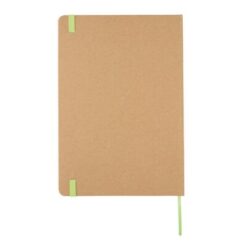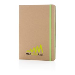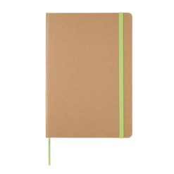 Notatnik A5 (72 kremowe kartki 70 g/m2 w linie), wykonany z papieru makulaturowego, tasiemka zakładkowa i elastyczna opaska do zamykania, ślad węglowy produktu: 0,52 kg CO2