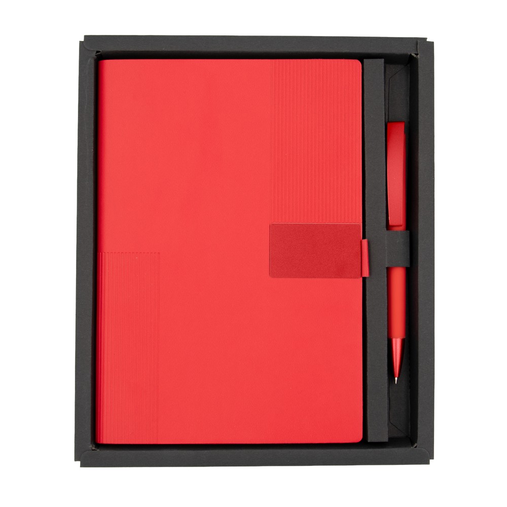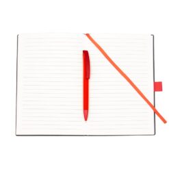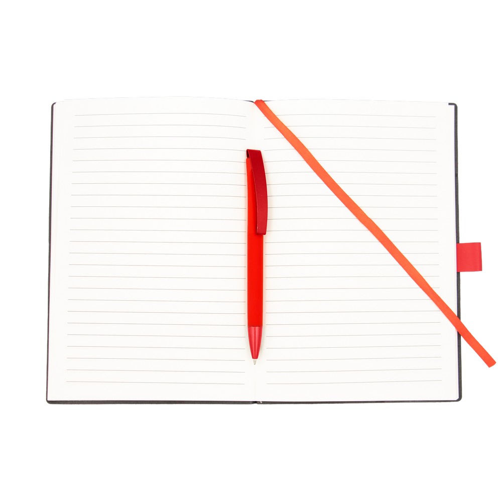 Notatnik w formacie ok. A5 posiada 80 kartek w linie (70 g/m²), tasiemka zakładkowa umożliwia wygodne zaznaczanie ostatniej strony lub ważniejszych notatek, w komplecie długopis typu „twist” z szerokim aluminiowym klipem przeznaczonym do grawerowania, przy szlufce na długopis znajduje się metalowa plakietka do grawerowania, twarda okładka wykonana z PU