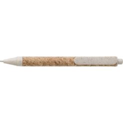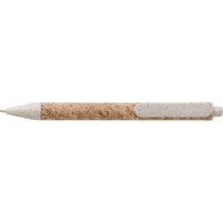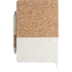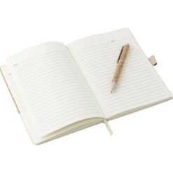 Notatnik (ok. A5, 80 kartek w linie), okładka wykonana z korka i płótna, tasiemka zakładkowa, długopis ze słomy pszenicznej w komplecie, w pudełku