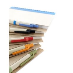 Notatnik w formacie ok. A5, posiada 60 kartek w linie (120 stron) i spiralne bindowanie, w komplecie znajduje się długopis z kolorowymi elementami, wkład w niebieskim kolorze, okładka wykonana z kartonu z kolorowym elementem przy bindowaniu
