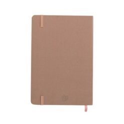 Notatnik A5 (80 kartek w linie), wykonany z kartonu z recyklingu i papieru z owoców, twarda okładka, tasiemka zakładkowa i elastyczna opaska do zamykania
