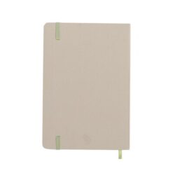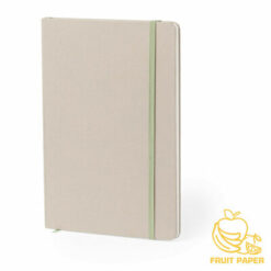 Notatnik A5 (80 kartek w linie), wykonany z kartonu z recyklingu i papieru z owoców, twarda okładka, tasiemka zakładkowa i elastyczna opaska do zamykania