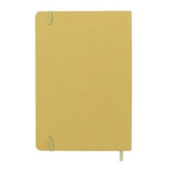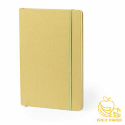 Notatnik A5 (80 kartek w linie), wykonany z kartonu z recyklingu i papieru z owoców, twarda okładka, tasiemka zakładkowa i elastyczna opaska do zamykania
