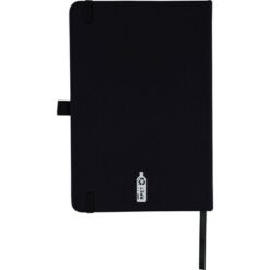 Notatnik w formacie A5, 70 g/m², posiada 70 kartek w linie, tasiemka zakładkowa umożliwia wygodne zaznaczanie ostatniej strony lub ważniejszych notatek, dodatkowe zamknięcie w postaci dopasowanej kolorystycznie elastycznej opaski, sznurek do przywiązania długopisu, ikona recyklingu z tyłu, produkt wykonany z RPET 600D i papieru