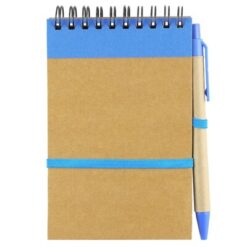 Notatnik reporterski w kieszonkowym formacie ok. A6, posiada 70 kartek w linie (140 stron) i spiralne bindowanie, dodatkowe zamknięcie w postaci dopasowanej kolorystycznie elastycznej opaski, w komplecie znajduje się długopis z kolorowymi elementami, wkład w niebieskim kolorze, produkt wykonany między innymi z kartonu