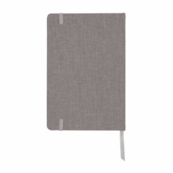 Notatnik w formacie A5, posiada 80 kartek w linie (160 stron), dodatkowe zamknięcie w postaci dopasowanej kolorystycznie elastycznej opaski, posiada metalowy element na grawerunek logotypu lub hasła, twarda okładka wykonana z RPET