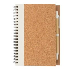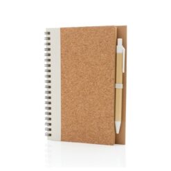 Notatnik (70 kremowych kartek z papieru makulaturowego 70 g/m2 w linie), korkowa okładka, spiralne bindowanie, dopasowany kolorystycznie długopis z papieru kraftowego w komplecie, niemiecki wkład Dokumental® w kolorze niebieskim w komplecie, długość pisania ok. 600 m, ślad węglowy produktu: 0,34 kg CO2