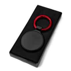 Okrągły brelok do kluczy z dedykowanym miejscem pod znakowanie, grawer ukazuje kolorową powierzchnię, czarne pudełko podarunkowe w komplecie, produkt wykonany z metalu