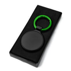 Okrągły brelok do kluczy z dedykowanym miejscem pod znakowanie, grawer ukazuje kolorową powierzchnię, czarne pudełko podarunkowe w komplecie, produkt wykonany z metalu