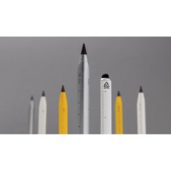 Ołówek, linijka, touch pen, wykonany aluminium z recyklingu, dzięki wykorzystaniu specjalnej wolnościerającej się grafitowej końcówki długość pisania ołówka to około 20 000 metrów w porównaniu z tradycyjnym ołówkiem którego długość pisania to około 200 metrów, notatki można zmazać standardową gumką do mazania, ślad węglowy produktu: 0,1 kg CO2