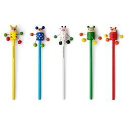 Ołówek „zwierzątko” z kolorowym trzonem, końcówka nie jest naostrzona, występuje w 5 różnych wzorach sprzedawanych losowo: tygrys, biedronka, mysz, żaba i krowa, produkt wykonany z drewna i nylonu