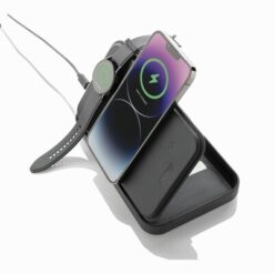 Organizer podróżny Swiss Peak z ładowarką bezprzewodową 3 w 1, 15W, wykonany z recyklingowanego PU RCS, przegrody na paszport i karty, uchwyt na kable, magnetyczny portfel wewnętrzny, ładowarka 15W do telefonu, ładowarka 5W do etui na słuchawki, ładowarka 2,5W do smartwatchy (Apple Watch), kabel TPE 120 cm, opakowanie FSC® mix, bez PVC, wejście 9V/3A, wyjście: telefon 15W, słuchawki 5W, zegarek 2,5W