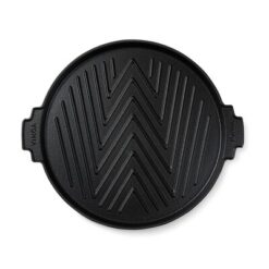 Patelnia grillowa, wykonana z emaliowanego żeliwa, specjalna konstrukcja umożliwia odpływ tłuszczu, działa na wszystkich rodzajach kuchenek, wyłącznie mycie ręczne, po umyciu należy wytrzeć patelnię do sucha