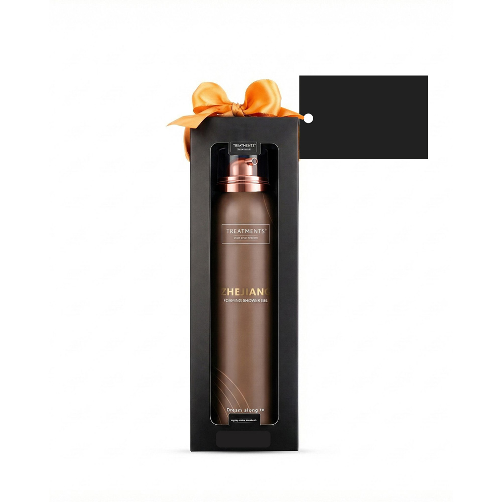 Pieniący się żel pod prysznic TREATMENTS, przeznaczony dla kobiet i mężczyzn, 200 ml, zapakowany w elegancki kartonik, sprawdzi się w codziennej pielęgnacji, dostępne różne warianty zapachowe: 03 – Ceylon (połączenie zapachów starożytnego Cejlonu z kwiatem owoców i jaśminem), 06 – Mahayana (aromat hiacyntów oraz korzenne nuty piżma i drzewa sandałowego), 08 – Omani (oddaje klimat Omanu – jego plaż, bezkresnych pustyń oraz drzewa sandałowego), 11 – Uyuni (lawenda, irys i drzewne nuty, które przenoszą w atmosferę Salar de Uyuni), 16 – Zhejiang (połączenie zapachu kaszmeranu z wanilią bourbon i jaśminem), 19 – Shinshiro (fasola tonki uzupełniona słodkimi aromatami i wonią kwiatów ryżu), 21 – Verona (romantyczny kwiatowy zapach łączący jaśmin i piwonię), 98 – Samoa (rajski zapach Samoa wzbogacony słodkim piżmem). Znakowanie produktu jest możliwe tylko na srebrnej lub złotej folii z czarnym nadrukiem albo na czarnej apli ze srebrnym lub złotym nadrukiem.