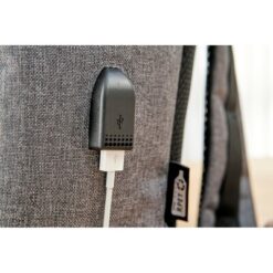 Plecak na laptopa 15″, wewnątrz plecaka znajduje się port USB z kablem w środku do ładowania urządzeń, duża kieszeń zamykana na zamek, kieszeń przednia zamykana na zamek, wewnętrzna przegroda na urządzenia do 15″, wewnętrzna przegroda na urządzenia do 10″, regulowane paski na ramię, można w nim przenieść książki, laptopa oraz drobne zakupy lub przybory, produkt wykonany z RPET