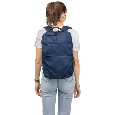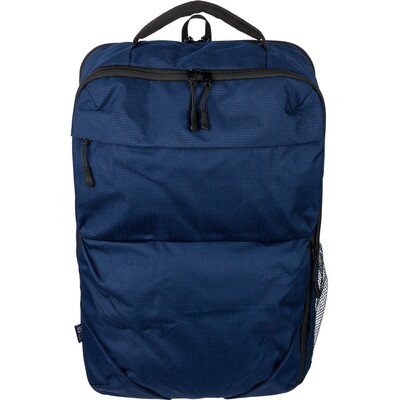 Plecak na laptopa 15″ o pojemności 20 litrów, kieszeń główna zapinana na zamek, przegroda na laptopa 15″, dwie małe kieszenie przednie zapinane na zamek, uchwyt ułatwiający noszenie, kieszeń boczna z siatką, wentylowane paski do noszenia na ramieniu, pasek do przymocowania do walizki, ikona OBP na metce, produkt wykonany z RPET 300D