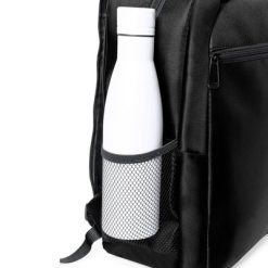 Plecak na laptopa 15″ z nylonu z recyklingu, główna przegroda i kieszeń przednia na zamek błyskawiczny, 2 boczne kieszenie siateczkowe, pasek do zamocowania na torbie podróżnej, miękki tył i regulowane paski na ramię