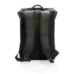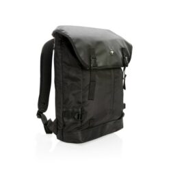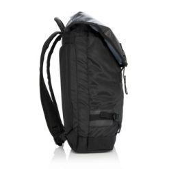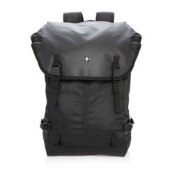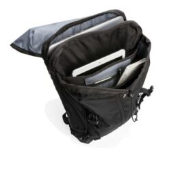 Plecak na laptopa 17″, wertykalny design, klapa do zamykania, miękka kieszeń na laptopa, kieszeń na tablet lub czytnik do ebooków, przednie kieszenie na akcesoria, pionowa kieszeń przednia zamykana na zamek błyskawiczny, miękkie, regulowane paski na ramiona, miękki tył, nie zawiera PVC, ślad węglowy produktu: 6,57 kg CO2
