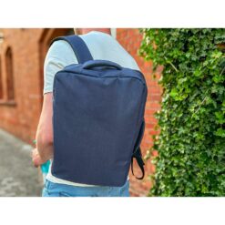 Plecak na laptopa 15,6″ z bocznym uchwytem umożliwiającym funkcjonowanie jako torba na laptopa, zapinana główna przegroda z miękką kieszenią na laptopa lub dokumenty, 2 małe kieszenie oraz 2 szlufki na długopisy, zamek błyskawiczny z dodatkowym pullerem ułatwiającym rozpinanie, pasek do zamocowania na torbie podróżnej, posiada regulowane paski na ramię umożliwiające dopasowanie ich długości do własnych preferencji, produkt wykonany z RPET