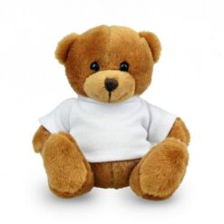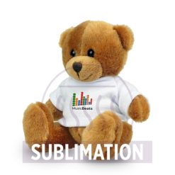 Brązowy miś z białą koszulką pod nadruk (nieoznakowana koszulka pakowana oddzielnie), wykonany z pluszu pochodzącego z poddanych recyklingowi butelek PET, zgodny z certyfikatem GRS (Global Recycled Standard)