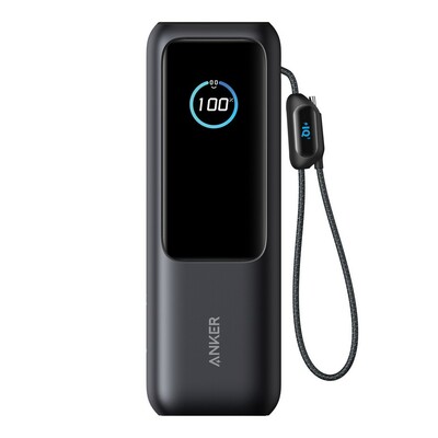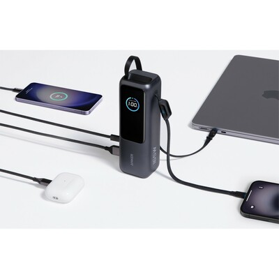 Power bank 25000 mAh, moc ładowania do 165W, wbudowany wyświetlacz, 2 zintegrowane kable USB-C, wyjście/wejście USB-C, wyjście USB, możliwość ładowania do 4 urządzeń jednocześnie