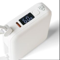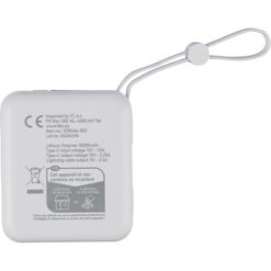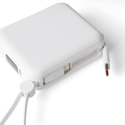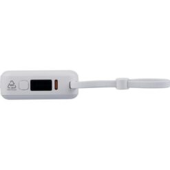 Power bank 10000 mAh, 22,5W, zestaw zawiera sznurek do przenoszenia z TPE (zintegrowany z obudową), który pełni również funkcję kabla do ładowania (USB-C i z końcówką kompatybilną z urządzeniami iOS), wskaźnik poziomu baterii na górnej części urządzenia, ikona RABS na produkcie, wejście i wyjście USB-C, wejście USB-A, w środku pudełka bibułka ochronna, bez woreczka foliowego, zawiera zabezpieczenia przed przegrzaniem, zwarciem, przepięciem i przeciążeniem prądowym, pakowany pojedynczo w brązowe pudełko kartonowe, produkt wykonany z recyklingowego ABS z baterią litowo-jonową