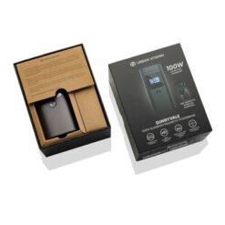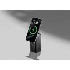 Power bank 15000 mAh, ładowarka bezprzewodowa 15W, posiada kolorowy wyświetlacz TFT pokazujący poziom naładowania, prędkość ładowania, ilość cykli ładowania, stoper, moc ładowania do 100W, trzy porty wyjściowe, 2 x USB-C i USB-A, wykonany z aluminium z recyklingu