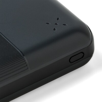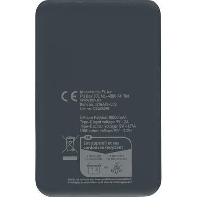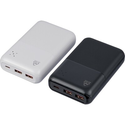 Power bank o mocy 22,5W i pojemności 20000 mAh z baterią litowo-jonową, wejście i wyjście typu C, wejście typu A, etykieta informacyjna z tyłu, ikona RABS na produkcie, posiada zabezpieczenie przed przegrzaniem, zwarciem, przepięciem i przeciążeniem, zapakowany pojedynczo w brązowe kartonowe pudełko, produkt wykonany z ABS z recyklingu