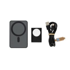 Ładowarka bezprzewodowa 3 w 1, bezprzewodowy, magnetyczny power bank 5000 mAh 5W, stacja dokująca do ładowania power banku, ładowarka bezprzewodowa 5W do słuchawek i drobnych akcesoriów, ładowarka bezprzewodowa 2,5W do smartwatchy (tylko iOS), wykonana z ABS z recyklingu z certyfikatem RCS, działa z telefonami posiadającymi możliwość ładowania indukcyjnego, wejście 5V/2.4A, wyjścia: 5V/1A, 5V/1A, 5V/0.5A, kabel 120 cm z TPE z recyklingu w komplecie, całkowita zawartość materiałów z recyklingu obliczona w oparciu o wagę całkowitą przedmiotu: 59%, w pudełku z certyfikatem FSC® mix
