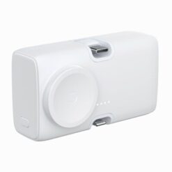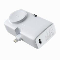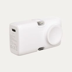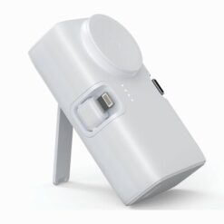 Power bank 5000 mAh, zintegrowana ładowarka bezprzewodowa do zegarka (tylko iOS), szybkie ładowanie do 20W, zintegrowane wyjścia USB-C i iOS, stojak na telefon, wyjście USB-C, działa z urządzeniami posiadającymi możliwość ładowania indukcyjnego, wykonana z ABS z recyklingu, całkowita zawartość materiałów z recyklingu obliczona na podstawie wagi całkowitej produktu: 24%