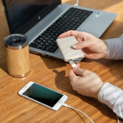 Power bank 5000 mAh, kieszonkowy rozmiar, 4 diody wskazujące poziom naładowania, wykonany z mieszanki naturalnych włókien pszenicznych (35%) i ABS, wbudowany akumulator litowo-polimerowy klasy A o dużej gęstości i trwałości, w pełni naładowane urządzenie może naładować telefon do 3 razy, 2 wyjścia USB do ładowania 2 urządzeń jednocześnie, wejście 5V/2A, wyjście USB 1: 5V/2A, wyjście USB 2: 5V/1A, kabel micro USB w komplecie