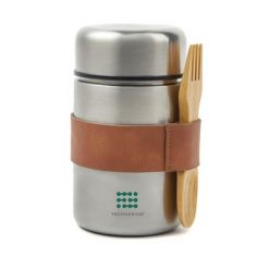Próżniowy pojemnik na żywność, wykonany ze stali nierdzewnej, opaska oraz drewniana łyżka w komplecie