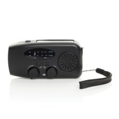 Radio survivalowe AM/FM, power bank 1800 mAh, latarka, możliwość ładowania za pomocą wbudowanej w tylnej części korby, posiada wbudowany panel słoneczny do ładowania, wykonany z ABS z recyklingu, całkowita zawartość materiałów z recyklingu obliczona na podstawie wagi całkowitej przedmiotu: 38%