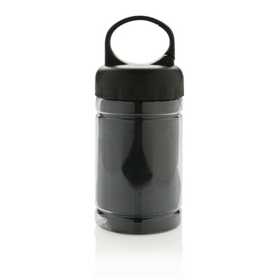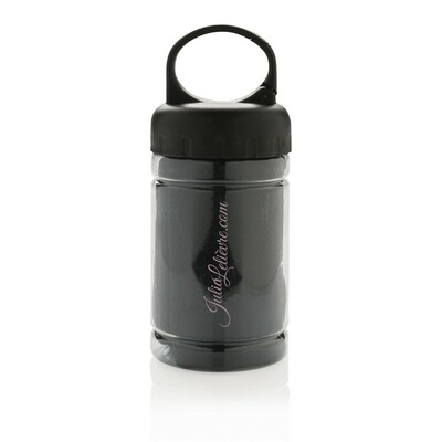 Ręcznik chłodzący z mikrofibry w pojemniku z PP, wieczko z ABS, ochrona przeciwsłoneczna na poziomie 98% i do UV 50+, funkcja chłodzenia po wlaniu zimnej wody do butelki, karabińczyk w komplecie, wymiar po rozłożeniu 77 x 30cm, ślad węglowy produktu: 0,8 kg CO2
