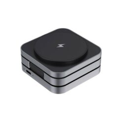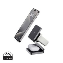 Ładowarka bezprzewodowa 3 w 1, składana, magnetyczna ładowarka bezprzewodowa 15W, ładowarka bezprzewodowa 5W do słuchawek i drobnych akcesoriów, ładowarka bezprzewodowa 2,5W do smartwatchy (tylko iOS), wykonana z PU z recyklingu, działa z telefonami posiadającymi możliwość ładowania indukcyjnego, wejście 9V/3A, wyjście dla telefonu 9 V/1.1 A, 9 V/1.67 A, 15 W, wyjście dla słuchawek 5V/1A, 5W, wyjście smartwatcha 5V/0.5A, kabel 120 cm z TPE z recyklingu w komplecie, w pudełku z certyfikatem FSC® mix