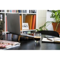 Składany stojak na laptopa, tablet, wykonany z wytrzymałego, naturalnego bambusa, podstawka zapewnia odpowiedni poziom cyrkulacji powietrza pod urządzeniem oraz właściwe położenie ekranu, kompatybilny z laptopami do 15,6″, może również służyć jako stojak na książkę, bawełniane etui w komplecie, ślad węglowy produktu: 0,42 kg CO2